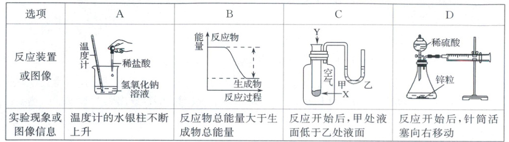 3 D 稀硫酸与锌粒反应后生成$\text H_2$,能够推动针筒活塞向右移动,不能确定该反应是否为放热反应,故选D。