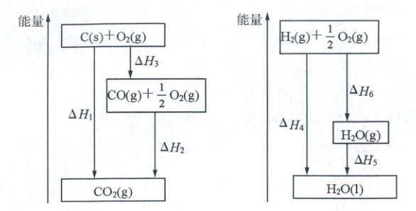 5. $ C(石墨) $与$ O_2 (g) $反应生成$ CO(g) $、$ CO_2 (g) $和$ H_2 (g) $与$ O_2 (g) $反应生成$ H_2 O(g) $、$ H_2 O(l) $的能量变化如下图所示。实验测得$ \Delta H_1 = -393.5 \, kJ/mol $、$ \Delta H_2 = -283.0 \, kJ/mol $、$ \Delta H_5 = -44.0 \, kJ/mol $、$ \Delta H_6 = -241.8 \, kJ/mol $;科学家通过研究发现$ \Delta H_3 = -110.5 \, kJ/mol $、$ \Delta H_4 = -285.8 \, kJ/mol $。请你仔细分析$ \Delta H_1 $、$ \Delta H_2 $与$ \Delta H_3 $之间以及$ \Delta H_4 $、$ \Delta H_5 $与$ \Delta H_6 $之间分别存在怎样的关系?