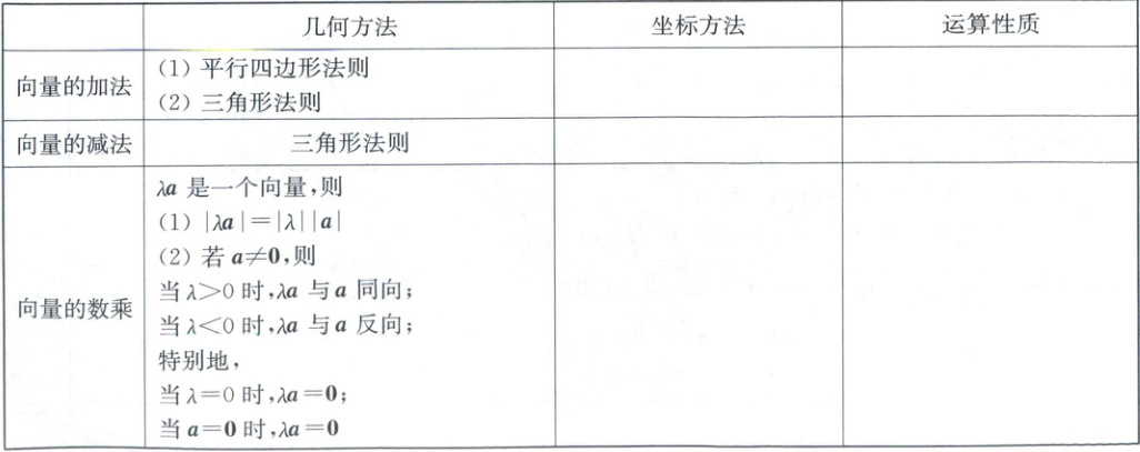 运算性质:$\lambda(\mu\vec{a}) = (\lambda\mu)\vec{a}$;$(\lambda+\mu)\vec{a}=\lambda\vec{a}+\mu\vec{a}$;$\lambda(\vec{a}+\vec{b})=\lambda\vec{a}+\lambda\vec{b}$。