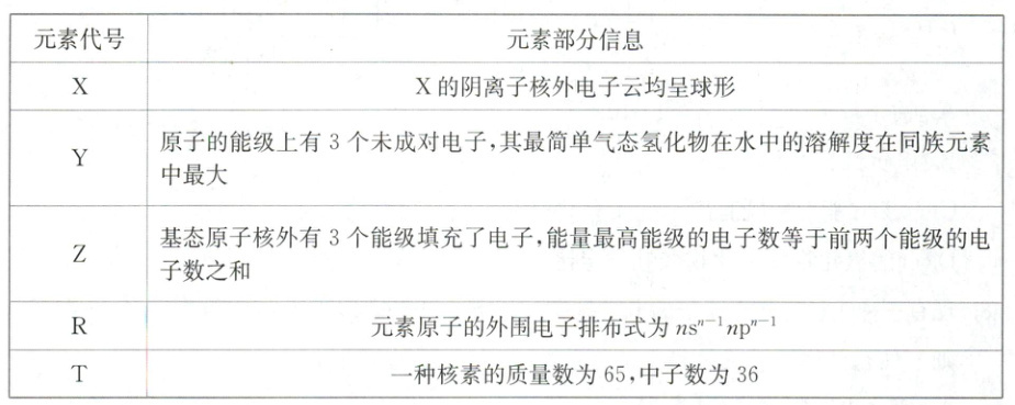 解析:(1)A、B、C、D、E代表前4周期原子序数依次增大的五种元素,A、D同主族且有两种常见化合物DA₂和DA₃,则D为S,A为O;B、E除最外层均只有2个电子外,其余各层全充满,则B为Mg,E位于元素周期表的ds区,则E为Zn,工业上电解熔融C₂A₃制取单质C,则C为Al。(2)A、B、C、D分别为S、Ca、N、Cl元素,原子最外层上有几个电子就有几种不同的运动状态,同一能级上电子的能量相同,所以S原子最外层有6种不同运动状态的电子,这些电子占据3s和3p两个能级,故有两种不同能量的电子。(3)X的阴离子核外电子云均呈球形,所以X为H;Y原子的能级上有3个未成对电子,其最简单气态氢化物在水中的溶解度在同族元素中最大,Y为N;Z的基态原子核外有3个能级填充了电子,能量最高能级的电子数等于前两个能级的电子数之和,Z为O;元素R原子的外围电子排布式为nsⁿ⁻¹npⁿ⁻¹,s轨道中最多能容纳2个电子,所以n等于3,R为Si;T元素的一种核素的质量数为65,中子数为36 ,T的质子数为29,T为Cu。