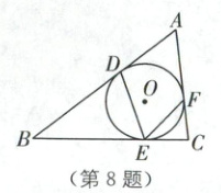 8. 如图,$\odot O$是$\triangle ABC$的内切圆,与$AB$、$BC$、$CA$的切点分别为$D$、$E$、$F$,若$\angle BDE + \angle CFE = 110^{\circ}$,则$\angle A$的度数是