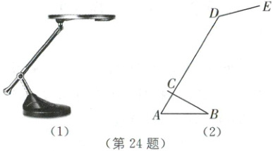 4. (8 分)如图是一种简易台灯的结构图,灯座为$\triangle ABC$($BC$伸出部分不计),$A$、$C$、$D$在同一直线上.量得$\angle ACB = 90^{\circ}$,$\angle A = 60^{\circ}$,$AB = 16\ cm$,$\angle ADE = 135^{\circ}$,灯杆$CD$长为$40\ cm$,灯管$DE$长为$15\ cm$.