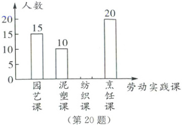 20. (12分)(2023·哈尔滨中考)军乐中学开展以“我最喜欢的劳动实践课”为主题的调查活动,围绕“在园艺课、泥塑课、纺织课、烹饪课四门劳动实践课中,你最喜欢哪一门课?(必选且只选一门)”的问题,在全校范围内随机抽取部分学生进行问卷调查,将调查结果整理后绘制成如图所示的不完整的条形统计图,其中最喜欢泥塑课的学生人数所占调查人数的20%,请你根据图中提供的信息解答下列问题: