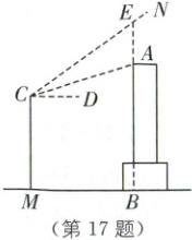 数据采集:如图,点$A$是纪念碑顶部一点,$AB$的长表示点$A$到水平地面的距离.航模从纪念碑前水平地面的点$M$处竖直上升,飞行至距离地面$20$米的点$C$处时,测得点$A$的仰角$\angle ACD = 18.4°$;然后沿$CN$方向继续飞行,飞行方向与水平线的夹角$\angle NCD = 37°$,当到达点$A$正上方的点$E$处时,测得$AE = 9$米.