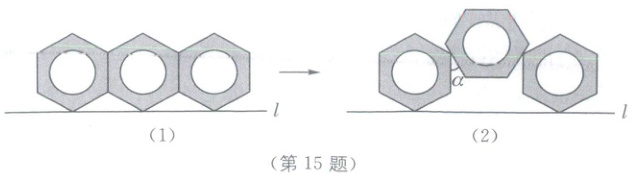 15. (2023·河北中考)将三个相同的六角形螺母并排摆放在桌面上,其俯视图如图(1),正六边形边长为$2$且各有一个顶点在直线$l$上.两侧螺母不动,把中间螺母抽出并重新摆放后,其俯视图如图(2),其中中间正六边形的一边与直线$l$平行,有两边分别经过两侧正六边形的一个顶点.则图(2)中: