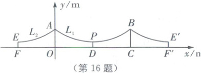 16. 新情境 构建抛物线模型(2024·陕西中考)一条河上横跨着一座宏伟壮观的悬索桥,桥梁的缆索$L_1$与缆索$L_2$均呈抛物线型,桥塔$AO$与桥塔$BC$均垂直于桥面,如图所示,以$O$为原点,以直线$FF'$为$x$轴,以桥塔$AO$所在直线为$y$轴,建立平面直角坐标系.已知:缆索$L_1$所在抛物线与缆索$L_2$所在抛物线关于$y$轴对称,桥塔$AO$与桥塔$BC$之间的距离$OC = 100\ m$,$AO = BC = 17\ m$,缆索$L_1$的最低点$P$到$FF'$的距离$PD = 2\ m$.(桥塔的粗细忽略不计)