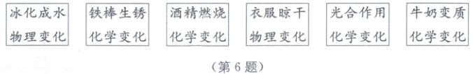6.$\frac{1}{3}$ [解析]从中随机抽取一张卡片共有6种等可能的结果,抽中生活现象是物理变化的有2种结果,所以从中随机抽取一张卡片,抽中生活现象是物理变化的概率为$\frac{2}{6}=\frac{1}{3}$.