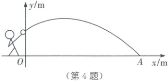4.(2025·宿迁沭阳期末)在中考体育测试中,小刚投出的实心球在空中的运动轨迹如图所示.实心球行进的高度$y$(m)与水平距离$x$(m)之间满足关系式$y = - \frac{9}{80}(x - 8)(x + 2)(x > 0)$,则实心球投出的水平距离$OA$为