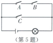 5.(2024·自贡富顺二模)如图,电路图上有$A$、$B$、$C 3$个开关和$1$个小灯泡,闭合开关$C$或同时闭合开关$A$、$B$都可以使小灯泡发亮.任意闭合其中的$1$个开关,小灯泡发亮的概率是