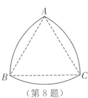 8.(2024·大庆中考)如图所示的曲边三角形也称作“莱洛三角形”,它可以按下述方法作出:作等边三角形$ABC$;分别以点$A$、$B$、$C$为圆心,以$AB$的长为半径作$\overset{\frown}{BC}$、$\overset{\frown}{AC}$、$\overset{\frown}{AB}$,三段弧所围成的图形就是一个曲边三角形.若该“莱洛三角形”的周长为$3\pi$,则它的面积是
