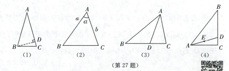 27. (10 分)综合与实践: 九年级某学习小组围绕“锐角三角形面积”开展主题学习活动.