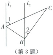 3.如图,直线$l_{1} // l_{2}$,$\triangle ABC$的顶点$A$、$B$分别在直线$l_{1}$、$l_{2}$上,$\angle 1=65^{\circ}$,$\angle 2=35^{\circ}$,$\angle C$的大小为(