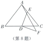 8.如图,在$\triangle ABC$中,$AB=AC=5$,$BC=6$,点$D$是$BC$的中点,点$E$在$AC$上且$CE=2AE$,将线段$DE$绕点$D$顺时针旋转$90^{\circ}$得到线段$DF$,连接$AF$,则$AF$的长为(