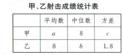 (1)8 7.5 0.8 [解析]甲的平均数为$a=\frac{1}{10} × (7 × 3+8 × 5+9+10)=8$,乙的中位数为$b=\frac{7+8}{2}=7.5$,甲的方差为$c=\frac{1}{10} × [3 × (7-8)^{2}+5 × (8-8)^{2}+(9-8)^{2}+(10-8)^{2} ]=0.8$.