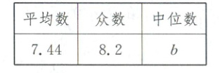 (1)4 7.7 [解析]$a=20-3-5-4-4=4$,将20个数据按由小到大的顺序排列如下:5.0、5.1、5.2、6.0、6.1、6.2、6.3、6.7、7.5、7.6、7.8、7.9、8.2、8.2、8.2、8.5、9.2、9.4、9.8、9.9,位置在中间的两个数为7.6、7.8,它们的平均数为7.7,$\therefore$这组数据的中位数为7.7,$\therefore b=7.7$.