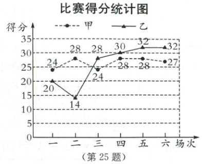 25. (12分)(2024·河南中考)为提升学生体质健康水平,促进学生全面发展,学校开展了丰富多彩的课外体育活动.在八年级组织的篮球联赛中,甲、乙两名队员表现优异,他们在近六场比赛中关于得分、篮板和失误三个方面的统计结果如下.