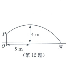 12. 新情境 投掷实心球(2024·广西中考)如图,壮壮同学投掷实心球,出手(点$P$处)的高度$OP$是$\frac{7}{4}m$,出手后实心球沿一段抛物线运行,到达最高点时,水平距离是5 m,高度是4 m.若实心球落地点为$M$,则$OM =$