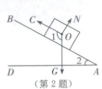 2. 跨学科 摩擦力与重力 (2025·泰州姜堰区期末改编)一块木块静止在斜面上,其受力分析如图所示,重力$G$的方向竖直向下($OG\perp AD$),支持力$N$的方向与斜面垂直($ON\perp AB$),摩擦力$f$的方向与斜面平行($OC// AB$).若摩擦力$f$与重力$G$方向的夹角$\angle 1 = 120^{\circ}$,则斜面的坡角$\angle 2$的正弦值是(
