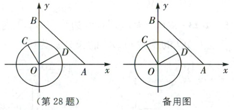 28. (10 分)中考新考法 操作探究 如图,在平面直角坐标系 xOy 中,已知点 A(6,0)、B(0,6),动点 C 在以 3 为半径的⊙O 上,连接 OC,过点 O 作 OD⊥OC,OD 与⊙O 相交于点 D(其中点 C、O、D 按逆时针方向排列),连接 AB.