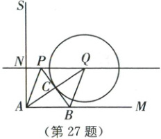 27. (10 分)(2025·无锡新吴区期中)已知线段 AM=5,射线 AS 垂直于 AM,点 N 在射线 AS 上,设 AN=n,点 P 在经过点 N 且平行于 AM 的直线上运动,∠PAM 的平分线交直线 NP 于点 Q,过点 Q 作 QB//AP,交线段 AM 于点 B,连接 PB 交 AQ 于点 C,以 Q 为圆心,QC 为半径作圆.