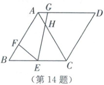 14. (2025·徐州十三中期末)如图,在菱形$ABCD$中,$\angle B = 60°$,$BC = 6$,$E$为$BC$的中点,$F$是$AB$上一点,$G$为$AD$上一点,且$BF = 2$,$\angle FEG = 60°$,$EG$交$AC$于点$H$,则$\frac{S_{\triangle BEF}}{S_{\triangle AGH}}$的值为
