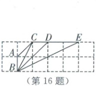 16. 如图,在正方形网格中有三个三角形,分别是$\triangle EBC, \triangle CDB, \triangle DEB$,其中与$\triangle ABC$相似的是
