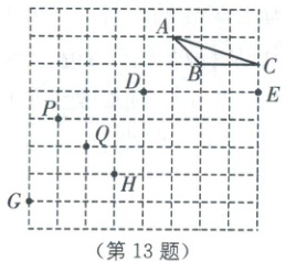 13. 图中的每个点(包括$\triangle ABC$的各个顶点)都在边长为1的小正方形的顶点上,在$P, Q, G, H$中找一个点,使它与点$D, E$构成的三角形与$\triangle ABC$相似,这个点可以是