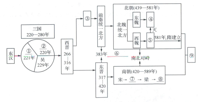 1. ①蜀 ②魏 ③十六国 ④北齐 ⑤北周 ⑥淝水之战 ⑦齐 ⑧陈 ⑨隋朝统一 实现全国性统一的朝代:西晋、隋朝。