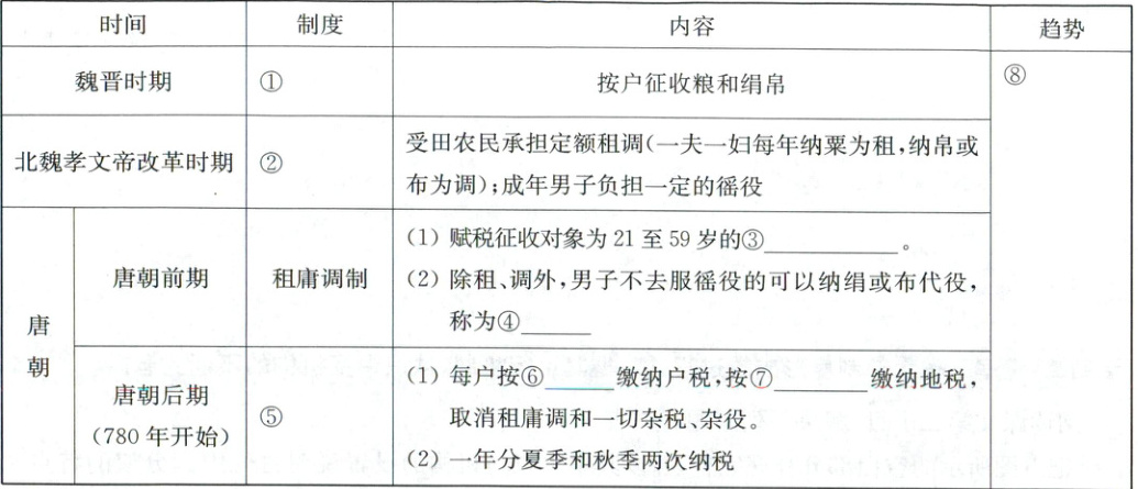 1. ①租调制 ②均田制 ③成年男子 ④庸 ⑤两税法 ⑥户亩 ⑦田亩 ⑧征税标准由以人丁为主到以资产、土地为主,减轻了政府对农民的人身控制