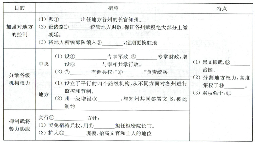 1. 结合所学知识,完成下表,并分析北宋初年加强中央集权的原因。