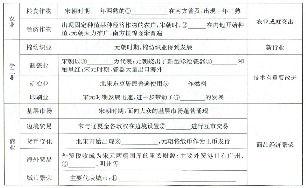 1. ①稻麦复种制 ②棉花 ③五大名窑 ④青花瓷 ⑤煤 ⑥造纸业 ⑦榷场 ⑧纸币——交子 ⑨泉州 ⑩北宋东京、南宋临安、元朝的大都和杭州