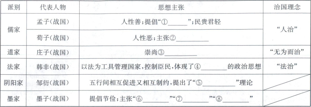 2. ①仁政 ②隆礼重法 ③逍遥自由 ④中央集权 ⑤相生相胜 ⑥兼爱 ⑦非攻 ⑧尚贤