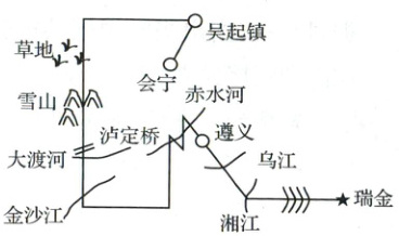 4. 红军长征付出了巨大的代价,两万五千里的征途上,平均每300米就有一名红军牺牲。结合右下侧的示意图,梳理遵义会议后红军长征的历程,并简述长征胜利的伟大意义。