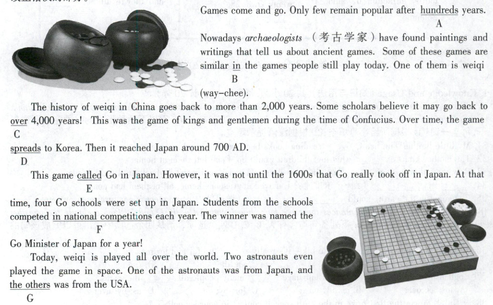50. G; the other。根据此句“Two astronauts even played the game in space.”可知两名宇航员甚至在太空中玩围棋这种游戏。one... the other... 表示两者当中的“一个……另一个……”