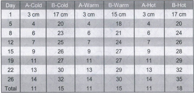 We then gave the three different A - plants water of different temperatures. For this experiment, we used water at 5 degrees Celsius (cold), 25 degrees Celsius (warm), and 50 degrees Celsius (hot). The plant labeled A - Cold always got cold water. A - Warm got warm water, and A - Hot got hot water. We used similar labels for the B - plants. We gave the plants water on Monday, Wednesday, and Friday. We also measured(测量)each plant on Tuesday and Thursday. We wrote down the height of each plant in the chart below.