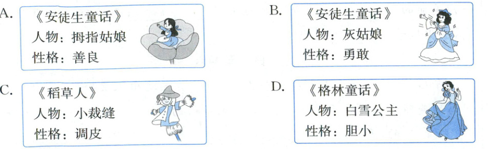 3. 读了童话,乐乐制作了下面四张童话故事人物卡,其中正确的一张是 (
