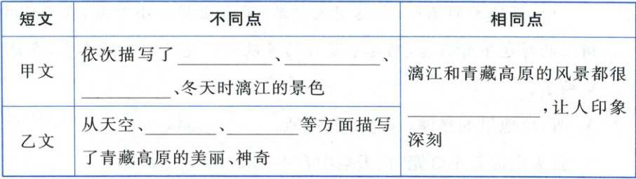 (1)甲文的作者通过描写春天漓江两岸万物复苏的景象,表现了春天漓江生机勃勃的特点。 (