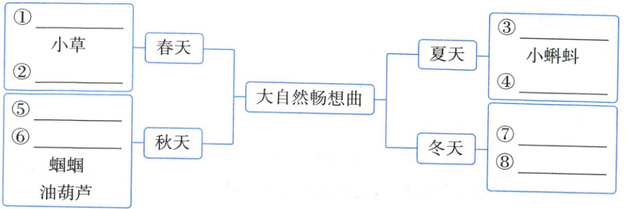 1. 新思维 逻辑梳理 用“——”画出点明短文主旨的句子,并想想短文描写了大自然四季的哪些事物,完成下面的思维导图。(4分)