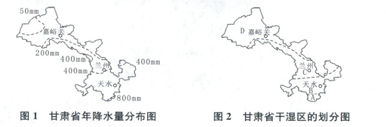 2. 甘肃省干湿区的划分依据是什么?是单一指标还是综合指标?图2中A、B、C、D分别指什么干湿地区?