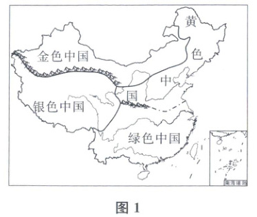 德国慕尼黑大学某教授把中国首先分成东部和西部,再分成南部和北部,形成四大综合区,并命名为“金色中国”“黄色中国”“银色中国”和“绿色中国”(如下图1所示)。图2为“我国部分生态问题的分布区图”(如下图所示)。据此完成4~5题。