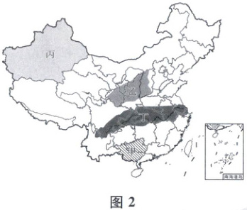 5.C 读图2可知,丙地区是新疆,气候干旱,土地荒漠化严重,A不符合题意;乙地区位于黄土高原,水土流失严重,B不符合题意;甲地区是广西,喀斯特地貌分布广,长期的水土流失导致土地石漠化严重,D不符合题意。故选C。