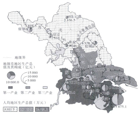 (2024连云港期末)江苏省是我国经济发达省区,但省内各市发展存在较大差距,省政府提出了区域协调发展战略以提升省内区域协调发展水平。下图为“江苏省某年区域综合经济分布图”(如下图所示)。据此完成6~8题。