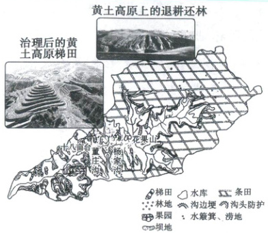 1. 材料一图中梯田主要分布在黄土高原什么地形区?该区治理措施还有什么?其作用是什么?