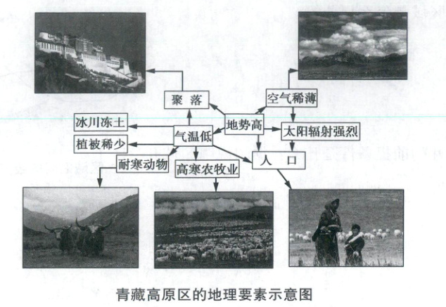 3 各自然要素之间的联系:青藏高原地势高,空气稀薄,太阳辐射强烈;地势高,气温低,冰川冻土广布;动植物种类少且以耐寒为特征等。 自然环境对当地人文环境的影响:自然环境制约着当地的工农业生产(以高寒牧业为主)、人口和城市分布(人口和城市及农业区集中分布在河谷地带)等。