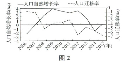 3.B 读图2可知,双鸭山市2006—2015年期间人口迁移率均为负值,其迁出人口大于迁入人口,人口持续外迁,B正确;读图1可知,双鸭山市人口总量近年来呈快速下降趋势而生产总值总体呈上升趋势,因此人均生产总值可能上升,A错误;读图2可知,双鸭山市人口自然增长率总体呈下降趋势,甚至出现负值,其人口老龄化问题严重,老年人口比重增加,C错误;读图2可知,人口自然增长率并非一直为负值,因此出生人口不是持续下降,D错误。故选B。
