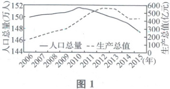 (2025南通开学考)《2019年新型城镇化建设重点任务》中首次提出“收缩型城市”概念,明确要求收缩型城市要“瘦身强体”,引导人口和公共资源向城区集中。黑龙江省双鸭山市是重要的煤炭资源型城市,湿地、森林资源丰富,近年来也出现了城市收缩的现象。图1为“双鸭山市2006—2015年生产总值和人口总量变化示意图”(如下图所示),图2(见下页左栏上图)为“双鸭山市2006—2015年人口变化示意图”。据此完成3~5题。