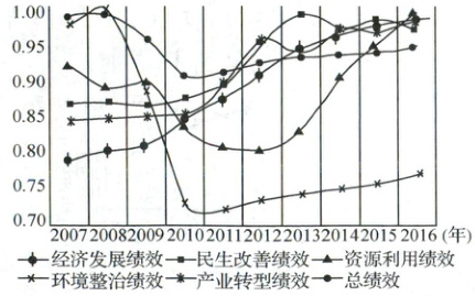 (2024连云港期末)湖北省大冶市因矿而兴,矿山开采使自然环境遭到严重破坏。随着资源逐渐枯竭,该地优势不再,矿产企业停产导致大量从业人员失业。下图为“2007—2016年大冶市转型发展绩效走势图”(如下图所示)。据此完成6~8题。