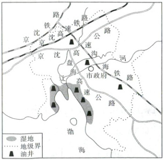 随着湿地上石油资源的开发,盘锦市依托辽河油田,逐渐形成了以油气开采为龙头,以石油化工、合成树脂和装备制造等为主的工业体系。近年来,随着开采力度的不断加大,辽河油田的石油资源日趋枯竭。2015年7月,投资近千亿元的与石油精细化工相关的“绿色石化园”项目落户盘锦市,该项目对盘锦市建设世界级石化及精细化工产业基地,对资源型城市转型意义重大。下图为“盘锦市石油分布图”(如下图所示)。