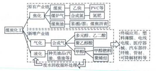 榆林市位于陕西省北部,煤炭储量占全国总储量1/5。长期以来,榆林煤炭化学工业层次较低,污染较大。近年来,随着国家对煤炭化工的重视,榆林市立足建设国家能源化工基地,对该地的煤炭化工产业链进行了升级,着力让其迈向高端化、多元化、低碳化。如图(见右栏上图)为“榆林市煤炭化工产业链改造前后对比示意图”。