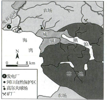 (2024徐州月考)区域调查是地理研究的重要方法,通过调查发现,美国某区域主要产业活动包括农牧生产、矿产开发、林木轮伐等,毗邻的湖泊是其主要水源地,近年来湖泊中氮、磷等元素逐年增加。下图为“某城镇所在区域简图”(如下图所示)。据此完成3~4题。